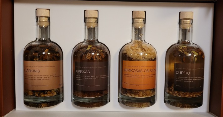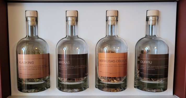 Į buteliukus įpyliau 40 % stiprumo degtinės, sandariai užkimšau ir suplakiau. Skystis buvo skaidrus ir tik nuo plakimo sukilę ir degtinėje plaukiojantys prieskoniai suteikė šiek tiek spalvos – kiekvienas butelis, tai tarsi tuščias lapas, laukęs savo istorijos.